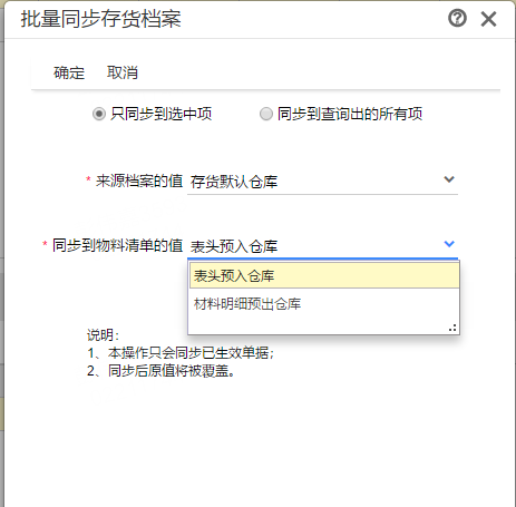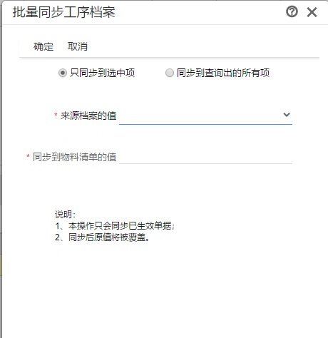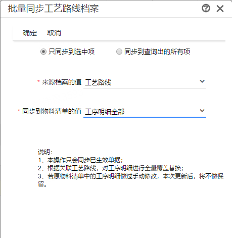 对于未审核的物料清单,支持多选物料清单,从关联的工艺路线拉取数据,同步覆盖至所选物料清单中。