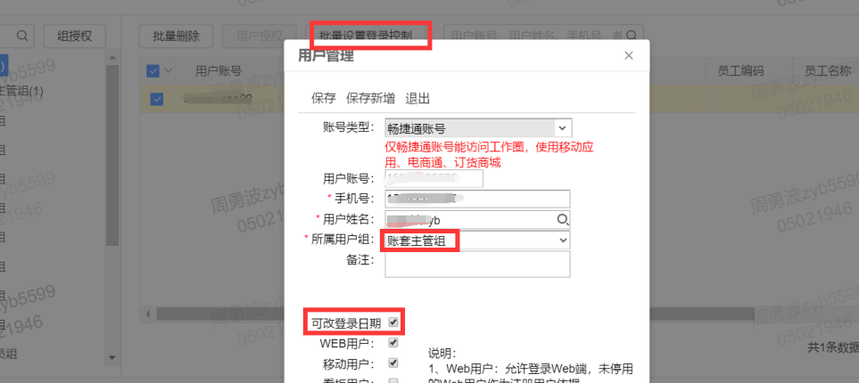 发表时间:2024-03-29 22:56 T+如何控制操作员修改登入日期权限【问题现象】T+如何控制操作员可以修改或不能修改登入日期权限的呢? 【问题分析】1. T+登入日期权限与其他功能性权限设置的地方不同,也不在【系统管理】-【用户权限】-【组授权】中进行权限设置,也并非账套主管就一定可以修改登入日期; 【解决方案】 1. 登入日期权限需要在【系统管理】-【用户权限】中找到用户双击打开,也可以批量设置登入控制,把【可改登入日期】勾选方可登入时修改登入日期。